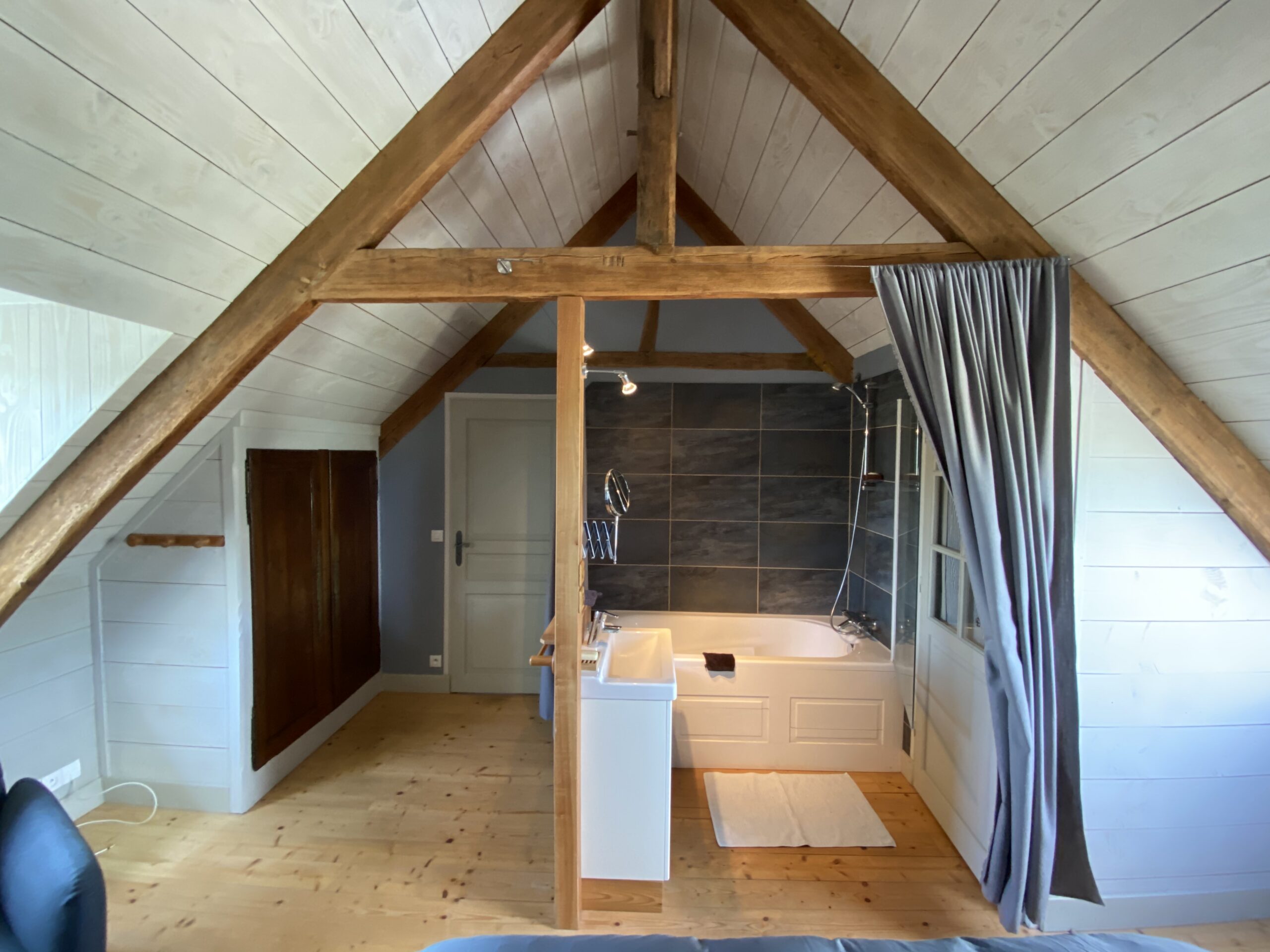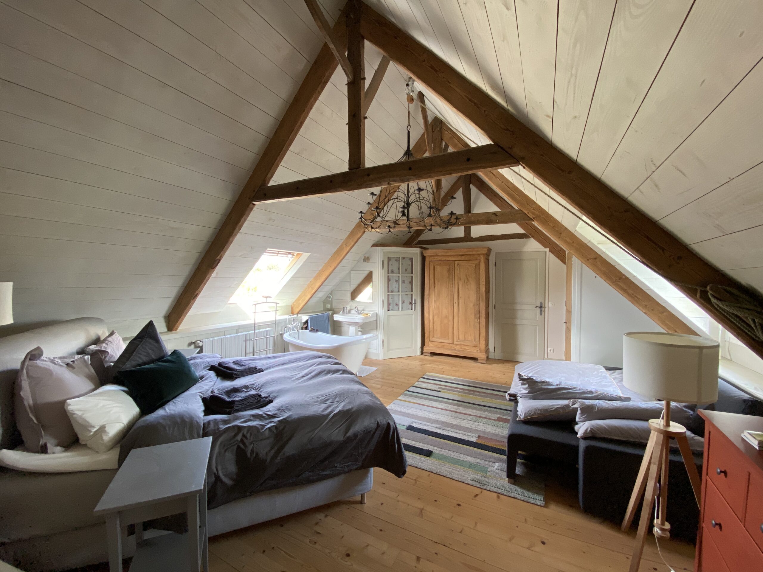 La salle de bain attenante est équipée d’une baignoire-douche, d’un lavabo et de toilettes séparées. Pour un repos optimal, les fenêtres peuvent être totalement occultées. Le parquet confère à la pièce une ambiance chaleureuse et élégante, tandis qu’une enceinte Sonos assure une ambiance musicale personnalisée.