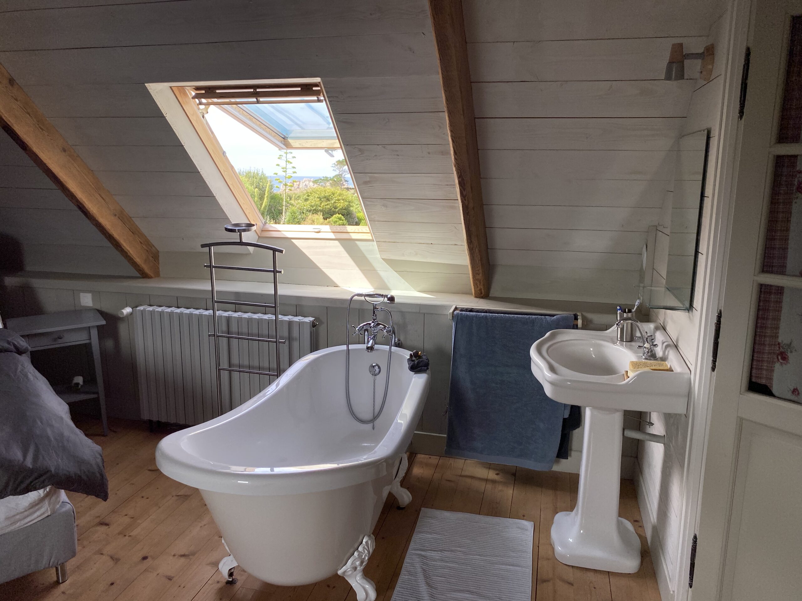 La salle de bain attenante comprend une baignoire, un lavabo et des toilettes séparées. Pour un repos optimal, les fenêtres peuvent être totalement occultées. Le parquet apporte une touche chaleureuse et élégante, tandis qu’une enceinte Sonos garantit une ambiance musicale agréable.