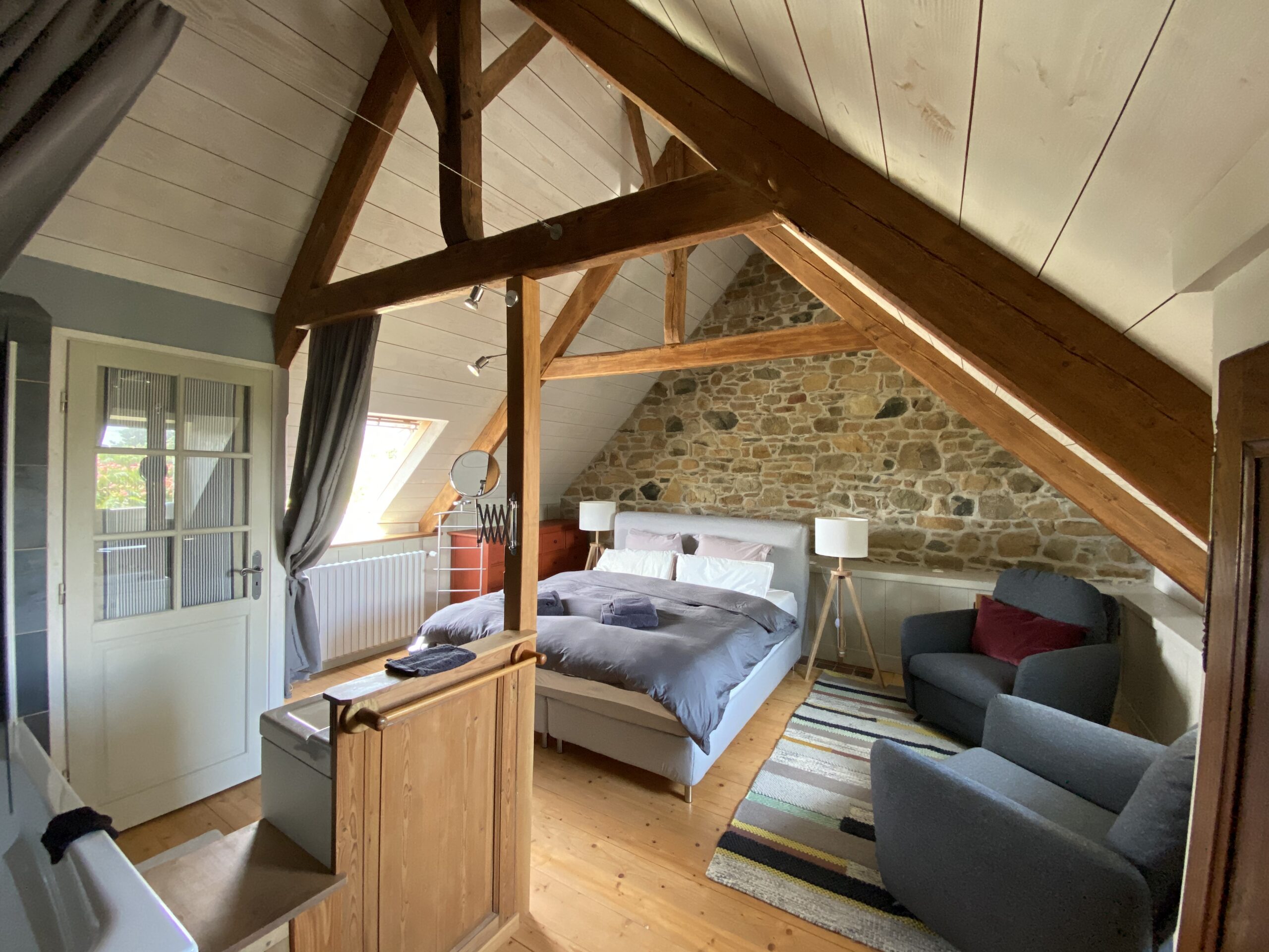 Le parquet avec chauffage au sol assure une chaleur douce, tandis que les fenêtres peuvent être occultées pour un repos optimal. Un véritable havre de paix avec vue et accès sur la nature.