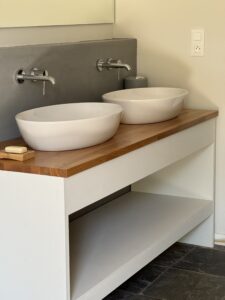 La nouvelle salle de douche, entièrement en béton ciré et chauffée au sol, dispose d’une douche italienne avec effet pluie, de deux lavabos et d’un chauffe-serviettes.