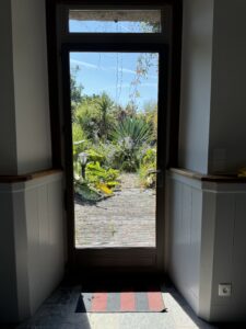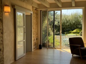 Une grande baie vitrée apporte beaucoup de lumière et permet un accès direct au jardin. Depuis cette pièce, un escalier mène à la chambre 5 (dortoir) et à son petit balcon.