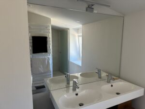 Les chambres 1 et 2 disposent d’une salle de bain privative et d’un WC privé. Les chambres 3 et 4 comme les chambres 6 et 7 (gîte) disposent d’une salle de bain attenante et de toilettes partagées. De plus, trois douches, une grande baignoire, trois WC et quatre lavabos sont répartis sur deux salles de bains et trois toilettes. Certaines salles de bains sont détaillées ci-dessous.