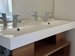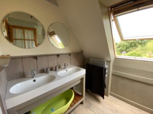 Équipée d’une douche, d’une toilette, de deux lavabos et d’un chauffe-serviettes, cette salle de bain suffit aux occupants du gîte.