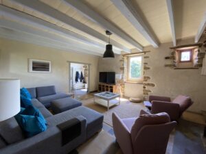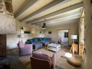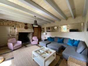 Le grand salon est un espace convivial avec un grand canapé pouvant accueillir plusieurs personnes, ainsi que deux fauteuils confortables. Une imposante cheminée ancienne apporte une touche authentique.