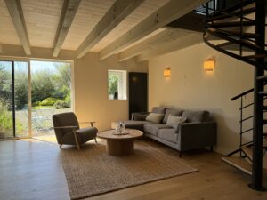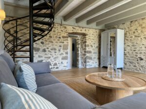 Ce coin salon, équipé d’un smart-tv 55 pouces et d’une machine Nespresso, est le troisième salon de la propriété. Son canapé en cuir et ses murs en granite massif procurent une atmosphère accueillante. Il est situé juste à coté d’une kitchenette, de l’espace co-working et d’un WC. Une porte vitrée donne accès à la petite cour privative, protégée du soleil par un figuier imposant.