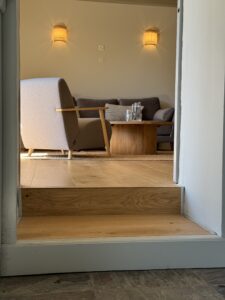 Le petit salon est aménagé avec un canapé et un fauteuil confortable, idéal pour un moment de calme. Son parquet ajoute une touche élégante et chaleureuse.