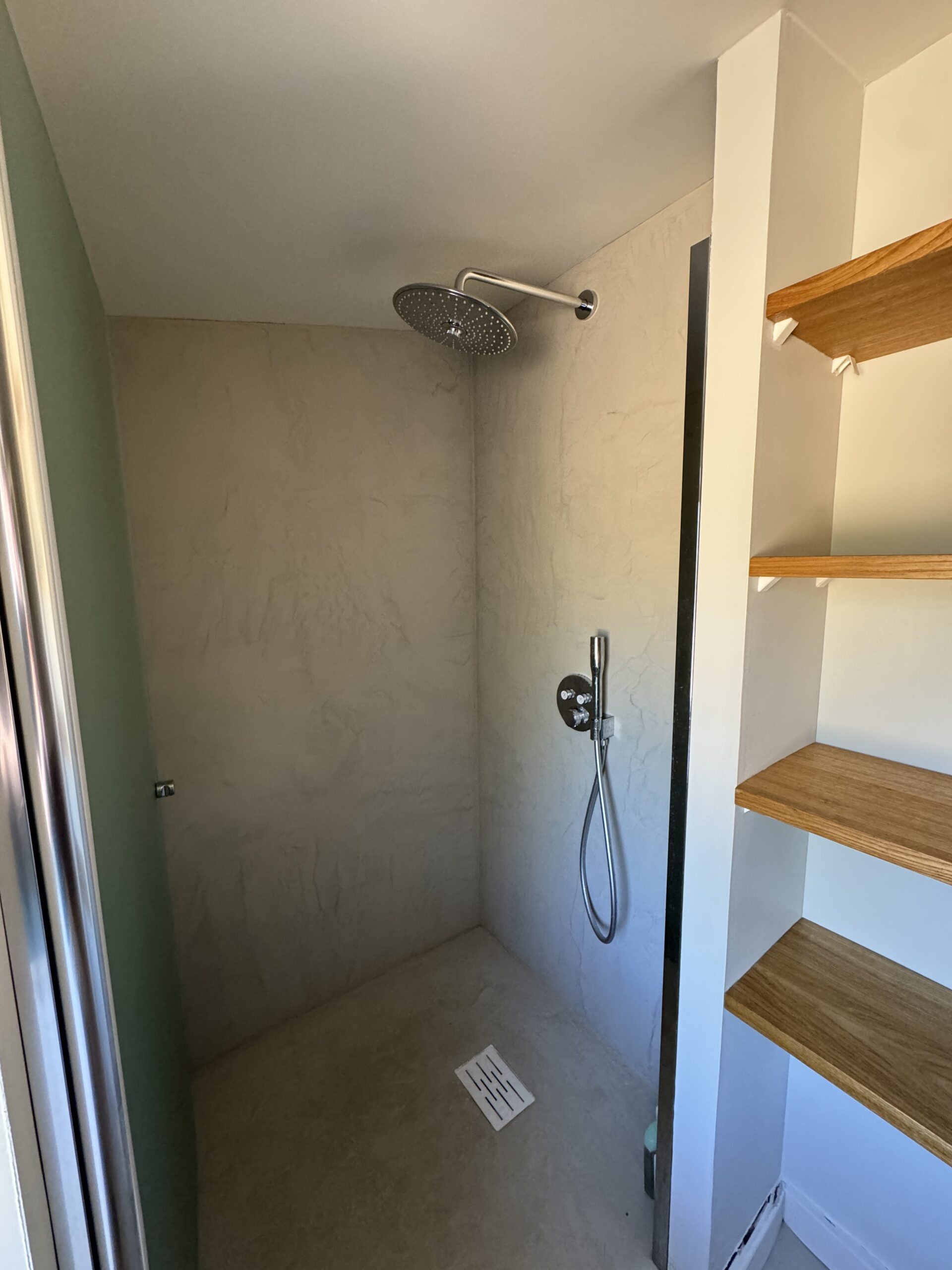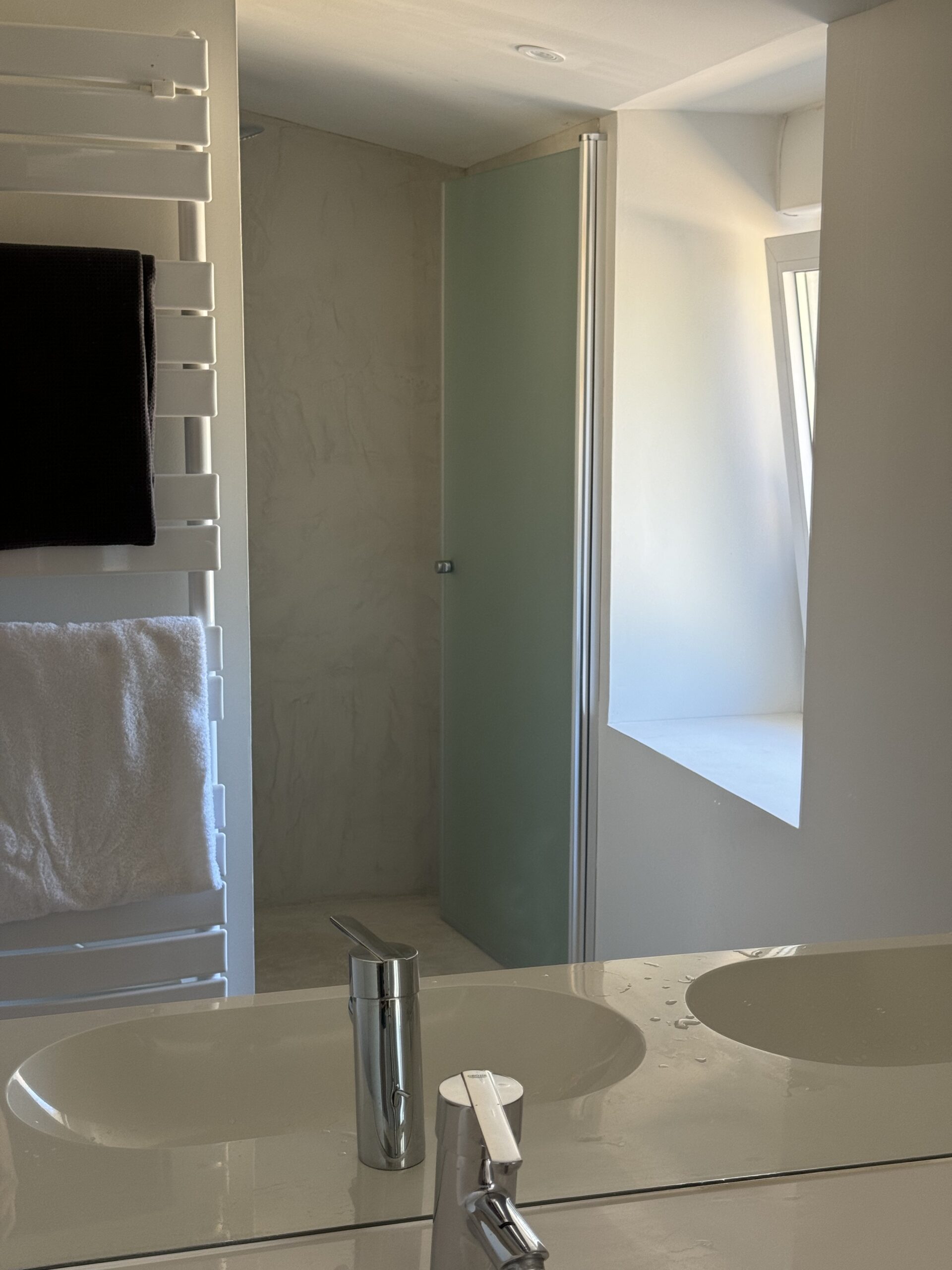 La nouvelle salle de douche, entièrement en béton ciré et chauffée au sol, dispose d’une douche italienne avec effet pluie, de deux lavabos et d’un chauffe-serviettes.