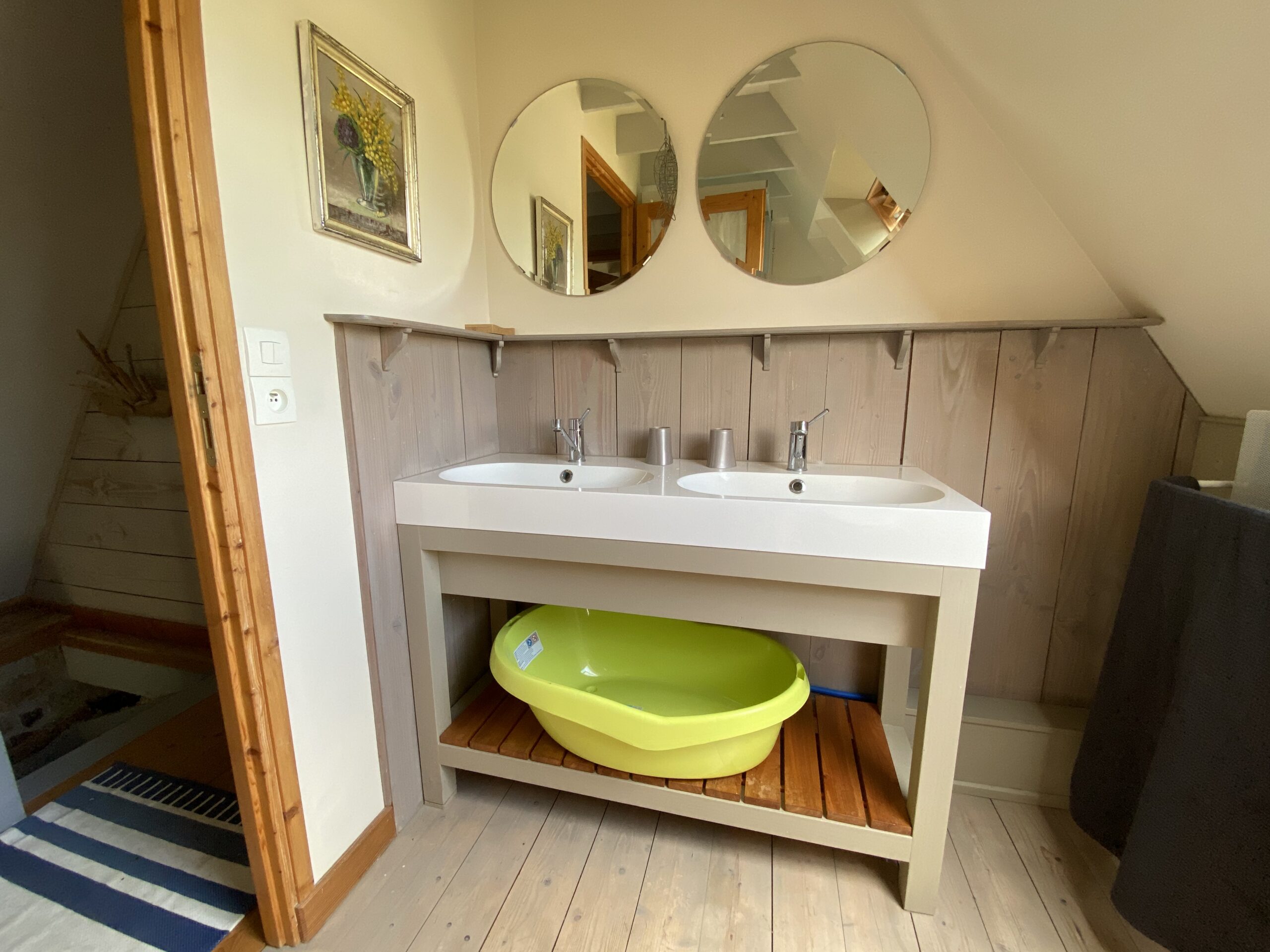 Équipée d’une douche, d’une toilette, de deux lavabos et d’un chauffe-serviettes, cette salle de bain suffit aux occupants du gîte.