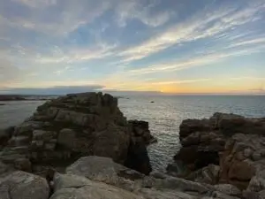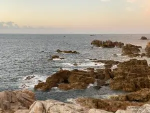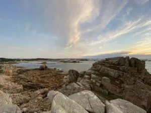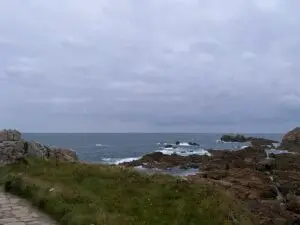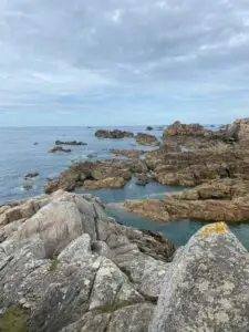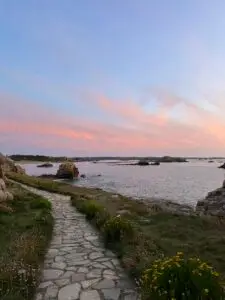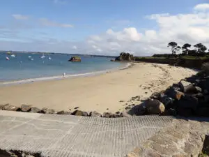La mer est donc visible de notre jardin. Mais c’est surtout à l’étage que l’on profite d’un magnifique paysage marin. Pour se baigner au plus près de la propriété, il suffit de parcourir 400 mètres d’un chemin plat et aisément praticable. La côte est à cet endroit majestueuse. En prenant la promenade qui la longe vers le Nord, nous atteignons bientôt (après 800 mètres) le site fameux du gouffre. Les amateur.rices de sable fin marcheront pour leur part 1,3 km (sur une route toujours aussi praticable et facile) pour trouver à Pors Hir une large et magnifique plage, abritée (car orientée Est) et baignable même quand la mer n’est qu’à mi-marée, ce qui est précieux dans cet endroit de Bretagne où les marées modifient profondément l’aspect de la côte même par petits coefficients. Idéale pour les jeux des enfants, cette plage est de plus dotée d’une cale où il est très aisé de descendre une embarcation.